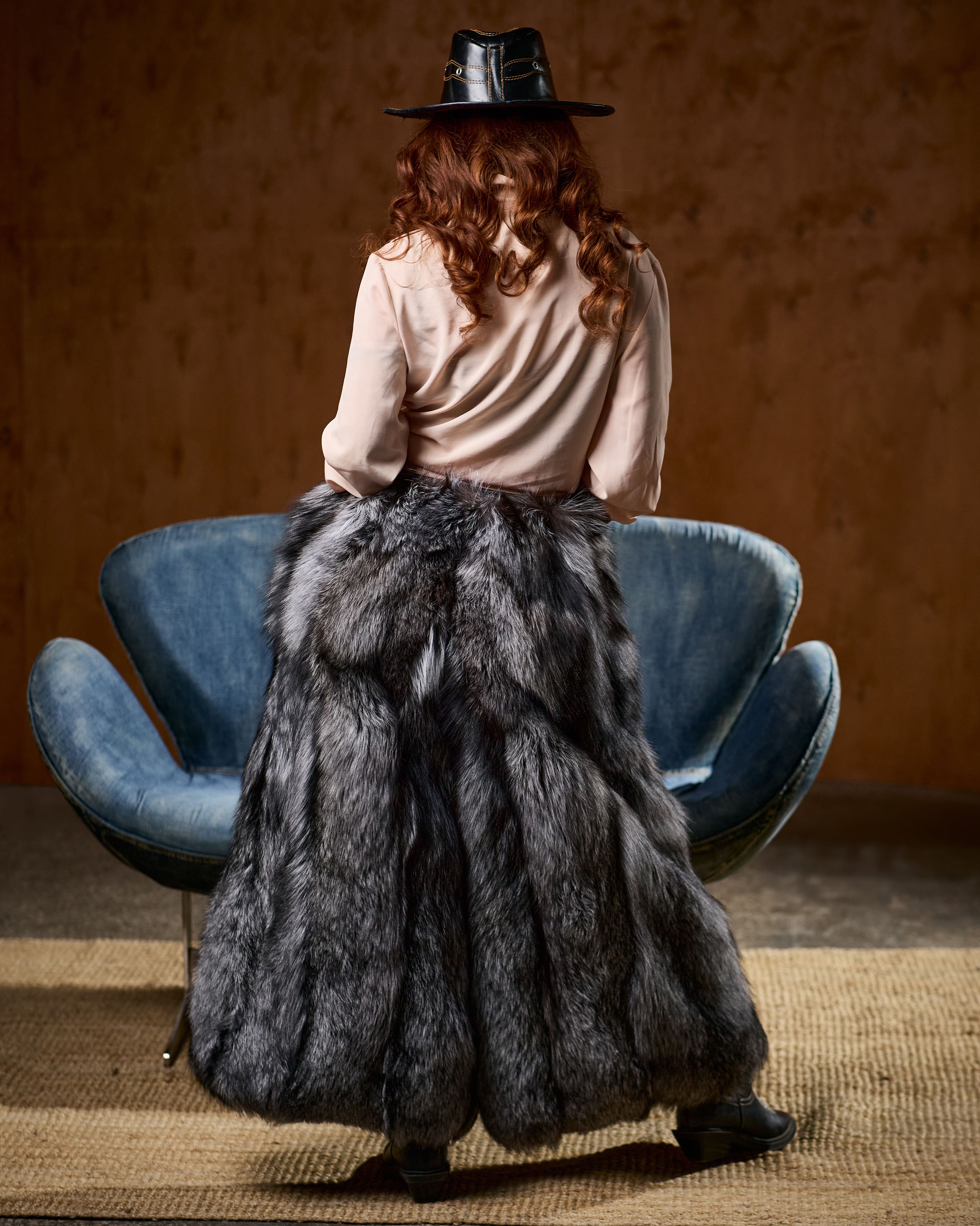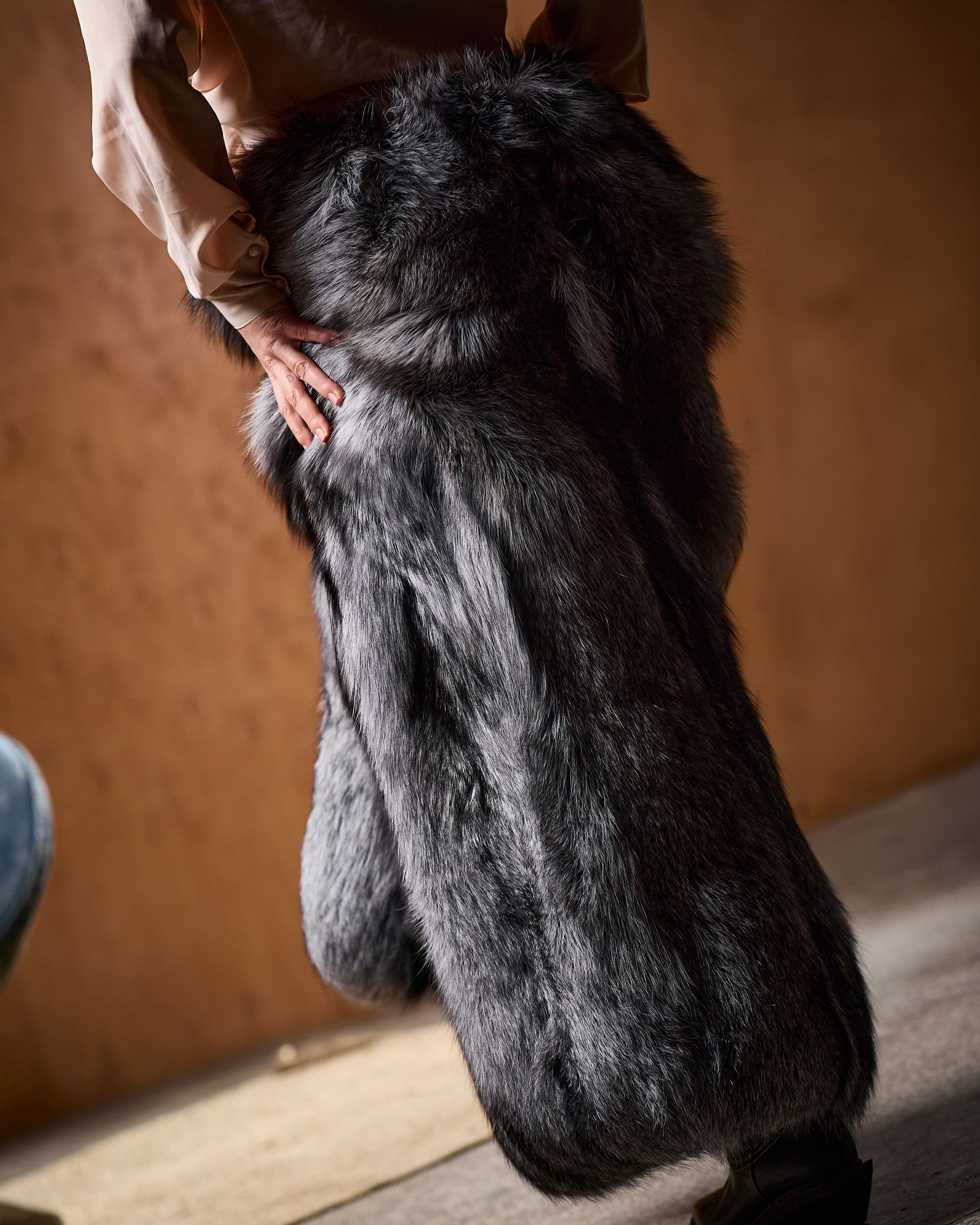 The long, flowing silhouette enhances movement and creates a dramatic visual effect, while the natural texture of silver fox fur adds depth, softness, and undeniable luxury.